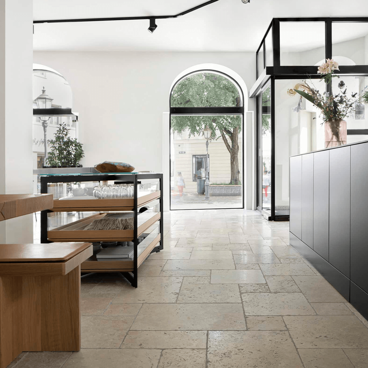 Travertin – Een warme, poreuze natuursteen met een rustieke uitstraling, vaak gebruikt voor terrassen, badkamers en gevelbekleding. |